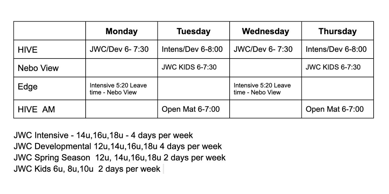 Tuesday/Thursday, 6:00-8:00p at HIVE JWC Intensive